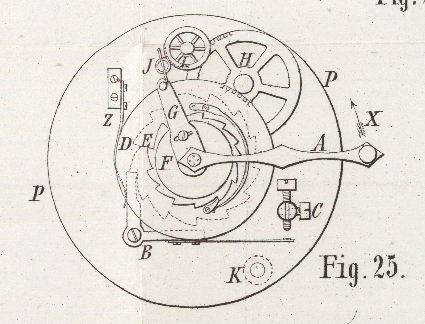 vom Knopf der Kurbel A entfernen, setzt sich das Rad D und das Uhrwerk in Bewegung, und die Kurbel A läuft auf ihren Ruhepunkt zurück; hierbei gleitet der