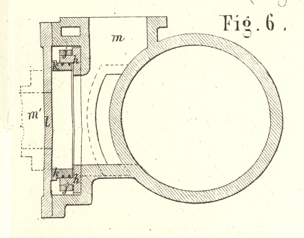 Die Entlastung des oben offenen Schiebers wird durch den Ring k erzielt, welcher durch eine Feder gegen den Schieberkastendeckel l angedrückt und durch im Querschnitt Fig. 6 ersichtlich
