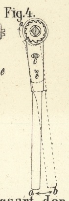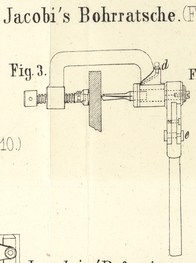 XXV. Jacobi's Bohrratsche. Mit Abbildungen auf Tab. III. Jacobi's Bohrratsche. Um die Bohrratsche unmittelbar, ohne Hülfe eines Widerlagstückes, des sogen. Bohrwinkels, an einem Werkstück anbringen zu können und hierbei ein rascheres Arbeiten zu ermöglichen, hat der Hüttendirector Jacobi in Kladno (Böhmen) die in Figur 3 und 4 dargestellte Anordnung vor mehr als einem Jahre getroffen und dieses Werkzeug mit sehr günstigem Erfolg bei den von der Adalberteisenhütte übernommenen Brückenbauten eingeführt. Die Construction dieser recht praktischen und sehr bequem zu handhabenden Bohrratsche ist aus den Abbildungen wohl genügend zu entnehmen. Es sey deßhalb nur auf die originelle Anordnung zur ruckweisen Drehung des Bohrers hingewiesen. Der auf und ab zu bewegende Hebel dreht sich um den Zapfen e und es ist das Führungsloch c so breitgezogen, daß bei Bewegung des Hebels im Sinne des Pfeiles b, also bei dessen Rückgang, das Sperrrädchen mit dem Bohrer ruhig stehen bleibt. Beim Vorgehen in der Pfeilrichtung a wirkt das obere, nun eingreifende Ende des Hebels als Stoßklinke und nimmt Rädchen und Bohrer mit. Der Vorschub des Bohrers wird durch Anziehen der Stellschraube erzielt, an deren rechtem Ende der Widerlagskopf durch einen eingedrehten Hals leicht drehbar befestigt ist. d bezeichnet den Verschlußstift für einen Oelcanal. Der Hebel ist absichtlich ganz auf die Seite gelegt, da sonst beim Bohren von ⊤förmigen Brückenträgern ein ungenügender Schwingungswinkel für den Hebel sich ergeben hätte. In ganz ähnlicher wie Eingangs bemerkter Absicht ließ sich vor kurzer Zeit J. Gilchrist in Glasgow eine Bohrratsche patentiren, deren Beschreibung im polytechn. Journal Bd. CC S. 277 (zweites Maiheft 1871) mitgetheilt wurde. Der Hebel ist in der Mitte des Bügels angebracht und der Drehmechanismus für den Bohrer wie gewöhnlich eingerichtet. Johann Zeman. (Technische Blätter, Jahrg. 1871, Heft II und III, S. 198.)