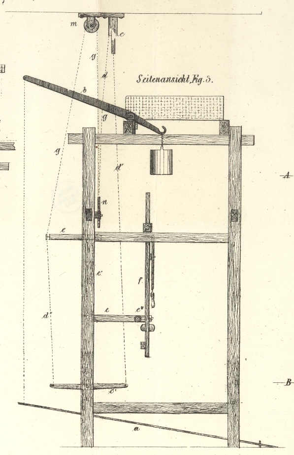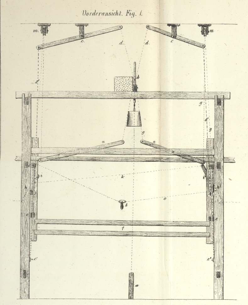 XCV. Ueber eine vom Webermeister F. Bettlach in Berlin erfundene und vom Verein zur Beförderung des Gewerbfleißes in Preußen prämiirte Vorrichtung zur Bewegung der Lade am Webstuhl; von Dr. Max Weigert. Mit Abbildungen auf Tab. VII. Bettlach's Vorrichtung zur Bewegung der Lade am Webstuhl. Die Fabrication doppelt breiter Stoffe, welche mit mehreren Schußfarben bearbeitet werden, erforderte bis zur Einführung der durch Robert Kay in Bury (in der zweiten Hälfte des vorigen Jahrhunderts) erfundenen Wechsellade zwei Arbeiter am Webstuhl, von denen der eine, welcher die Bewegung der Tritte und Lade gleichzeitig besorgte, die Schützen von der einen Seite des Gewebes nach der anderen schnellte, während eine zweite Person (der sogenannte Schußjunge) dieselben auffing und zurückwarf. Die Wechsellade, welche somit das Lancirverfahren – bei dem der Einschlag in der ganzen Breite des Gewebes hin und her geht – erleichterte, wurde vervollkommnet zur Brochirlade, welche gestattete, beim Brochirverfahren, wo der Schuß nur an den Stellen des Stoffes eingetragen wird, bei denen er im Muster figurirt, zu gleicher Zeit eine Anzahl Schützen in der Breite des Gewebes in Bewegung zu setzen. Bei Geweben jedoch, welche einen großen glatten Fond und nur an den Kanten verschiedenartige Musterung haben, – wie z.B. bei den sogenannten Grandfond-Shawls – bei denen weder das Lancirverfahren (der kostspieligen Vergeudung des Musterschusses wegen, der im größten Theil des Gewebes flott liegen und aufgeschnitten werden würde) – noch die Brochirlade praktische Anwendung finden kann, müßte der Arbeiter, wenn er außer der Bewegung der Lade, welche durch die Hand geschieht, noch die Schußfarben einzeln an beiden Seiten des Gewebes eintragen sollte, zur Beschleunigung der Arbeit eine zweite Person zu Hülfe nehmen. Diese Schußjungen sind indessen, besonders in großen Städten, sehr schwer zu erlangen, der Schulzwang hindert ihre Beschaffung, und sie bilden eine große Plage der Weber. Diesem Uebelstande nun soll die zu beschreibende Vorrichtung Abhülfe schaffen. Sie gestattet dem Arbeiter, das Weben der erwähnten Stoffe allein, in der nämlichen Zeit als zu Zweien, auszuführen, indem sie die Bewegung der Lade seiner Hand entzieht. Durch den an der Jacquardmaschine befindlichen Hebel, welcher durch den Tritt gesenkt und gehoben wird, werden mittelst Schnüren Hebel in Bewegung gesetzt, welche zwei an den inneren Seitenwänden des Stuhles befindliche nasenförmig gestaltete Hebelvorrichtungen vor- und rückwärts ziehen. Dieselben sind an den Ladenarmen befestigt und bewirken durch ihre Bewegung gleichzeitig die Bewegung der Lade, welche somit ohne Mitwirkung der Hand des Webers durch den Fuß beim Treten des Maschinentrittes geschieht. Außerdem ist die Schützenbewegung derartig eingerichtet, daß der Schneller zu gleicher Zeit mit einem Zuge die Schützen aus beiden Schützenkästen herausschnellen kann. Beim Grundschuß, welcher durch die ganze Breite des Gewebes eingeschlagen wird, befindet sich natürlich in den zur Wirkung kommenden Kästen der Wechsellade nur ein Schütze, welcher von der einen nach der anderen Seite geschnellt wird. Beim Musterschuß jedoch, welcher nur an den beiden Kanten figurirt, schnellt der Weber mit einem leichten Ruck aus den beiden auf der Schützenbahn befindlichen Kästen die Schützen zu gleicher Zeit hinaus, um sie dann wieder zurückzuwerfen. Genauer läßt sich die beschriebene Vorrichtung aus den Zeichnungen. Fig. 13 erkennen. In denselben bedeutet: a den Maschinentritt, b den Maschinenschwengel, c zwei an der Zimmerdecke befindliche zweiarmige Hebel, welche durch die Schnüre d mit dem Maschinenschwengel und durch d' mit den an den unteren Enden der vorderen Seitenpfosten des Stuhles befindlichen Hebeln c' verbunden sind. Die Schnüre d'' führen zu den um e' drehbaren nasenförmigen Hebelvorrichtungen e, e, welche bei e'' mit der Lade f verbunden sind. Beim Treten des Maschinentrittes senkt sich b, und mit ihm d, dadurch wird d' gehoben, d'' gesenkt, und die Hebelvorrichtung c vorn herabgedrückt, während sich der bei e'' befindliche Theil hebt und die Lade herausbewegt. Das Zurückfallen der Lade, welches schon durch das eigene Gewicht derselben erfolgen würde, wird beim Heben des Maschinentrittes durch die oben über die Rollen m gehenden, unten mit den Hebeln n verbundenen Schnüre g regulirt. Zur Verdeutlichung der Schützenbewegung diene: Der Schneller l bewegt mittelst der Schnur o den auf der rechten Seite des Stuhles befindlichen um i' drehbaren zweiarmigen Hebel h' und schnellt den Schützen nach links; zu gleicher Zeit wird durch die Schnur k der auf der linken Stuhlseite angebrachte, um i drehbare einarmige Hebel h nach rechts bewegt und dadurch der Schütze in dieser Richtung hinausgeschnellt. Beide Schützen werden also durch den nämlichen Schnellerzug zu gleicher Zeit in Bewegung gesetzt. (Aus den Verhandlungen des Vereines zur Beförderung des Gewerbfleißes in Preußen, 1871 S. 211.)