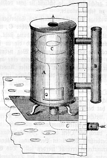 CXXVIII. R.George's Gasofen (Calorigen) zur Zimmerheizung. Mit einer Abbildung. George Gasofen zur Zimmerheizung. Das Calorigen von R. George, welches von Farwig und Comp. in London (36, Queenstreet, Cheapside) ausgeführt wird, ist eine neue Art Gasofen, welcher die Einwürfe gegen die gewöhnliche Methode der Zimmerheizung mittelst Gas entkräften soll. Die Haupteinwände gegen die trotz vielfacher Veränderungen doch wenig verbesserten Gasöfen gingen darauf hinaus, daß entweder der größere Theil der durch das Gas entwickelten Wärme unbenutzt durch den Schornstein entweiche, oder daß das Zimmer, worin der Ofen steht, durch die in dem Zimmer zurückbleibenden Verbrennungsproducte ungesund gemacht würde. Beiden Uebelständen begegnet das Calorigen. Die ganze durch die Verbrennung des Gases erzeugte Wärme wird ausgenutzt, während die Verunreinigungen der Zimmerluft durch die Ausströmungsöffnung abgeführt werden, welche mit der Einlaßöffnung so angelegt ist, daß durch beide Oeffnungen gerade nur so viel Luft hindurchgeht, als zur Unterhaltung der Verbrennung und zur Abführung der Verbrennungsproducte erforderlich ist. Es wird nämlich ein Strom warmer Luft von außen in das Innere eines Gebäudes hinein geführt, durch welchen dasselbe zu gleicher Zeit erwärmt und auch mit frischer Luft versorgt wird. Textabbildung Bd. 202, S. 553 Das Calorigen besteht nach der vorstehenden Abbildung aus dem Ofen A, welcher ein Cylinder aus Walzeisen ist, am Boden und oben geschlossen, so daß das Innere desselben, welches den Brenner enthält, ganz gegen die Zimmerluft abgeschlossen ist. Dieser Cylinder ist mit zwei Röhren ausgestattet, von denen die eine nahe am oberen Ende angebracht ist und die Verbrennungsproducte abführt, während die andere nahe am Boden die zur Verbrennung, welche in ihr stattfindet, erforderliche Luft zuführt. Diese beiden Rohre gehen durch die Mauer hindurch und münden in der außerhalb des Zimmers gelegenen cylindrischen Kammer B, welche bloß am oberen Ende offen ist, weßhalb die in den Ofen eintretende Luft mit der den Ofen verlassenden heißen Luft in Berührung kommt; dieß bildet einen natürlichen Regulator des Luftstromes und verhütet eine große Wärmeverschwendung. Es mag beim ersten Blick unmöglich erscheinen, unter solchen Umständen die Verbrennung zu unterhalten. Die Schwierigkeit löst sich aber durch die Thatsache, daß, wenn leichte und schwere Luft gleichzeitig in ein Gefäß strömt, die leichte in die Höhe steigt, während die schwerere zu Boden sinkt. So werden in dem Calorigen die Gasdünste aus dem Raume abgeführt, ohne etwas von der Luft mit fort zu nehmen, und auch ohne Hervorrufung von Zug, da keine Verbindung zwischen dem Ofen und der Zimmerluft besteht. Wenn die Ofenthür geschlossen ist, so schließt sie jene vollständig ab, obgleich sie das Licht zu sehen erlaubt. Eine weitere wichtige Eigenthümlichkeit des Calorigens liegt in der Einführung einer gewundenen schmiedeeisernen Röhre C, welche, wie die Abbildung zeigt, mit der äußeren Luft in Verbindung steht. Diese Röhre kann nach dem Zimmer hin geöffnet werden und die in sie eintretende und in ihr den durch die Pfeile angedeuteten Weg nehmende Luft bewirkt eine reichliche Ventilation, obwohl sie bereits eine angenehme und gesunde Temperatur angenommen hat. Bei dieser Anordnung ist der gewöhnliche Gang umgekehrt, indem die Uebelstände in einem gewöhnlichen Zimmer – die Räume rund um die Thüren und Fenster – anstatt ausgiebige Quellen von Zug und Unannehmlichkeit zu seyn, die Mittel zum Entweichen der Luft aus dem Zimmer werden. Der Erfinder hat dasselbe Princip auch mit gleichem Erfolg auf Oefen angewendet, welche mit Kohlen oder anderem Brennmaterial geheizt werden. Obgleich bei dieser Anordnung alle Luft, welche für das Zimmer nöthig ist, durch den Ofen in das Zimmer gelangt, so kommt sie doch nie mit überheißem Metall in Berührung, während eine große Ersparniß an Brennmaterial erreicht werden soll. Das Calorigen wird bereits in ausgedehnter Weise für die Zwecke des Trocknens und Heizens benutzt, und bewährt sich überall. In dem Arsenal zu Woolwich wurden von Fachmännern des Kriegsdepartements Versuche mit dem neuen Ofen angestellt, zu dem Zwecke, um ihn in den verschiedenen zum Arsenal gehörigen Vorrathshäusern etc. anzuwenden. (Mechanics' Magazine, October 1871, S. 286.)