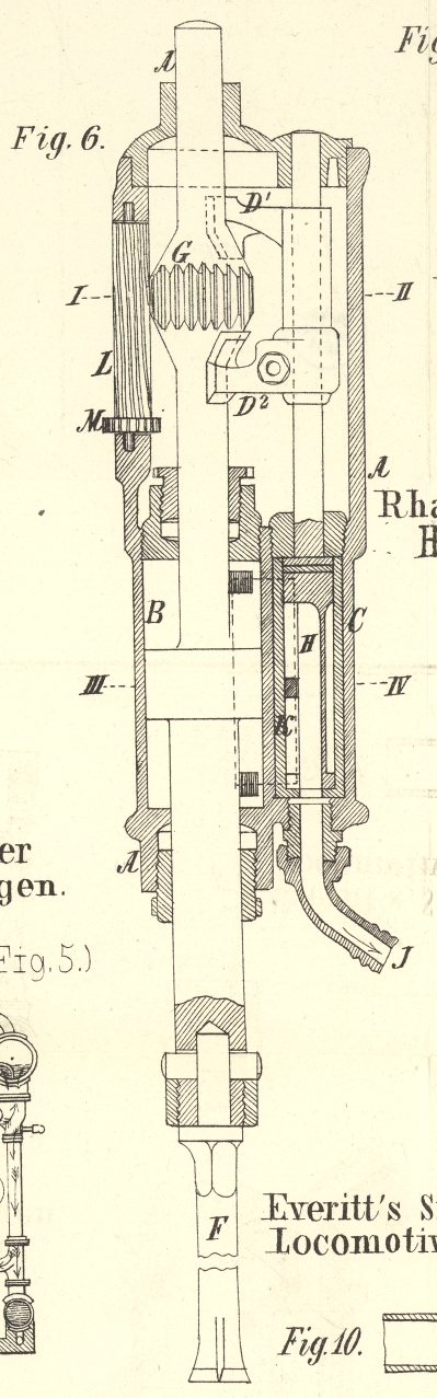 Geht die Kolbenstange mit dem Bohrer vorwärts, so wird die Schraube L einfach gedreht; beim Rückgang aber verhindert der