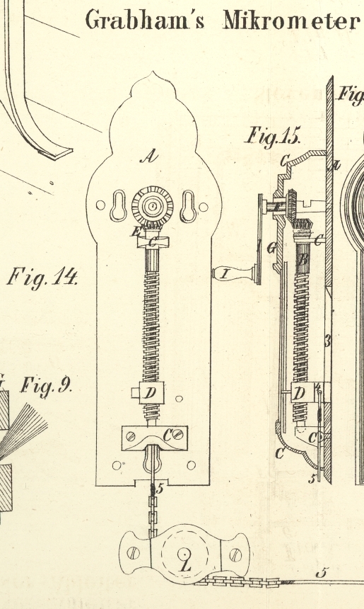 stellen den Apparat in verschiedenen Ansichten und Details dar. Die Metallplatte A trägt ein Gehäuse, welches die Schraube B umschließt, deren beide Lager C an die Platte A befestigt sind. An ihrem