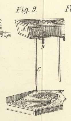 durch die Röhre herabfallen läßt, wobei man den Strahl mittelst eines Schiebers B regulirt. Der zu gravirende Artikel, z.B. eine