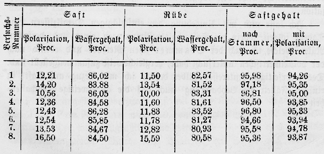 die Rübenzucker-Industrie im Zollverein, 1866, Bd. XVI S. 521. durchgeführt, ergab die Rübe meist einen höheren Saftgehalt als 96 Proc., so