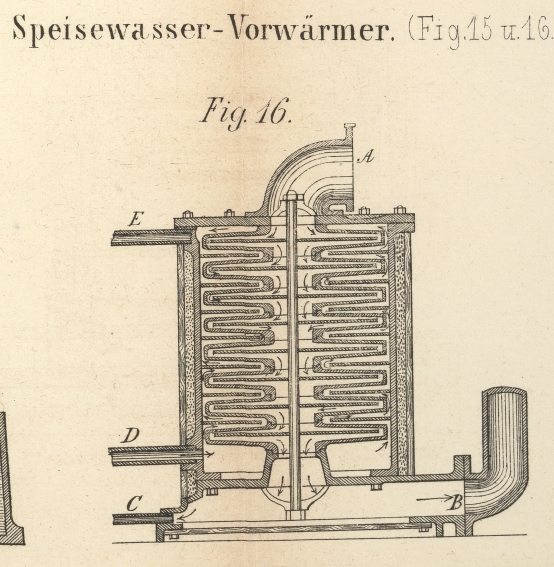 Das durch die Pumpe angezogene Wasser geht in der Pfeilrichtung durch das Rohr a nach dem Vorwärmer, wo es in etwa der halben Höhe eine siebförmig