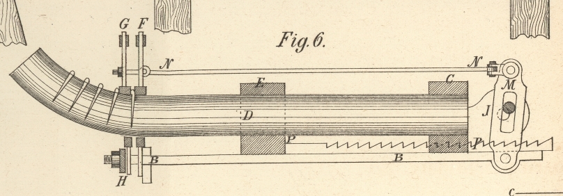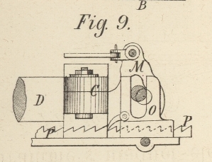 Krummzapfenwelle K wirkt außer auf M auch noch auf einen Schieber O, der die Zahnstange P übergreifend auf B hingleiten kann und einen Einleger besitzt, der in die