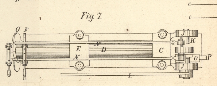 L dann zurückgedreht, so geht der Schieber O nach links und schiebt mittelst des Einlegers die