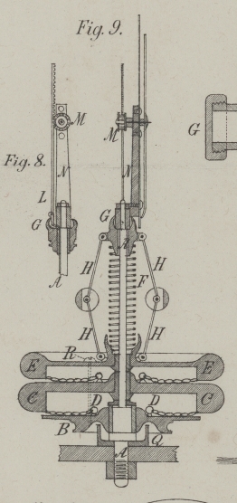 diese Kugeln von der Achse und drücken dadurch die Feder F zusammen. Die auf und nieder gehende Bewegung von G wird nun dem Zeiger vor dem Zifferblatt mitgetheilt.