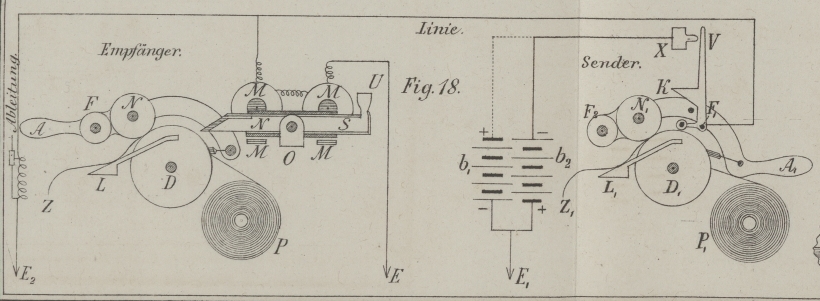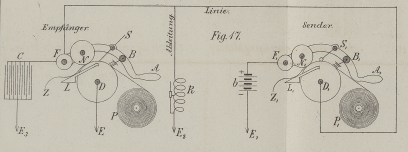 und durch den Empfänger, und dieser schreibt das Telegramm in Morse-Schrift auf den Streifen P,