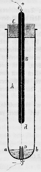 gegossen, jedoch nur bis ungefähr zur halben Höhe der Elektrode f und des Capillarröhrchens D. Bezeichnet ab das Niveau der