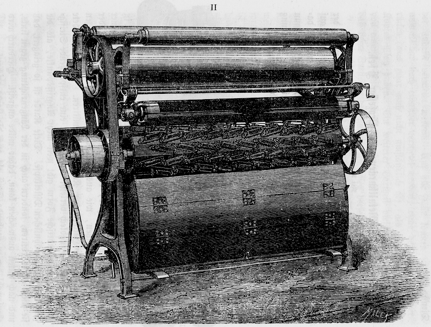 auch zum Rauhen der Stoffe verwendet. Die Rauhmaschinen theilen sich in zwei Gruppen