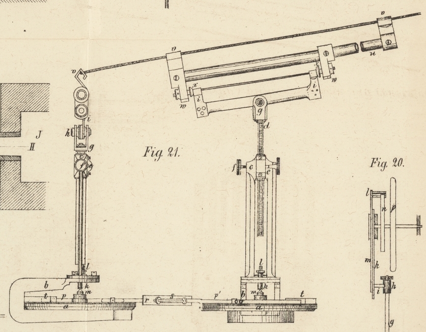Leitstange d ist der Scharnirkopf g festgeschraubt, in welchem sich der Hängebalken h mit den Hängehaken ii bewegt. Oberhalb