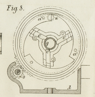 Bewegungsmechanismus. Die gleichmäßige radiale Verschiebung der Einspannbacken c (Fig. 7) und Schneidbacken