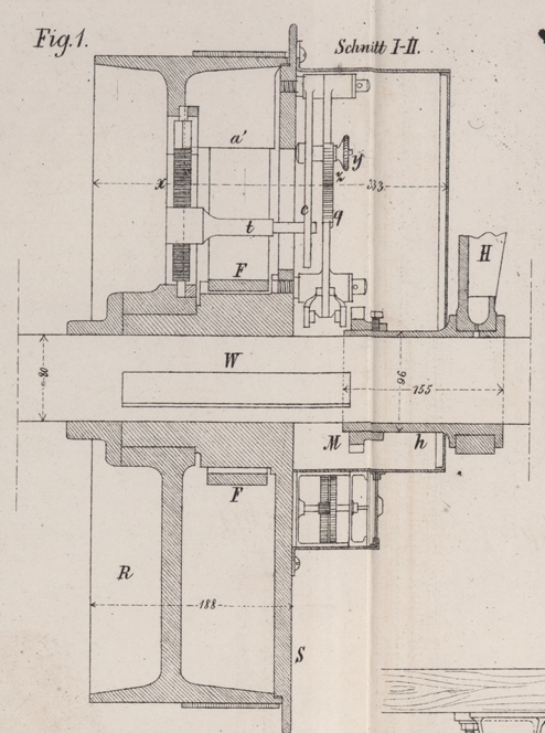 Feder f eine Frictionsscheibe N gedrückt, welche in einem auf der