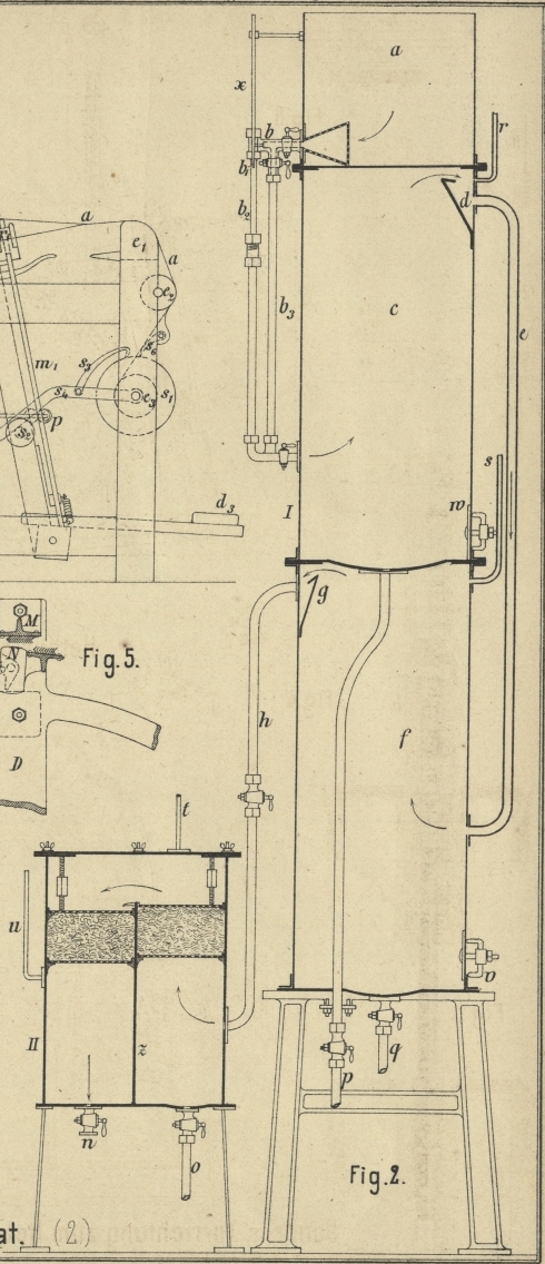 verschlieſsbaren Löcher w und v gestatten eine vollständige Reinigung der Behälter c und f, welche etwa alle