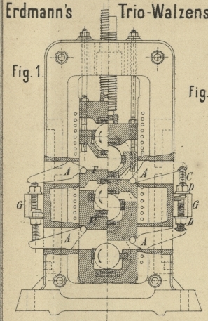 | Titel: | Trio-Walzenständer mit vollkommen entlasteter stellbarer Lagerung der Walzenzapfen, Conrad Erdmann's Patent. |
