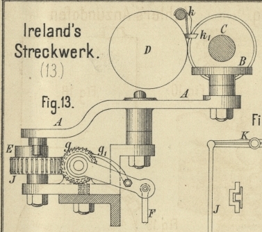 hergehende Bewegung ertheilt. Diese erhalten jetzt nur etwa 9 bis 10mm Breite, die Holzwalzen dagegen 25mm; die Verhältnisse haben sich also gegen früher
