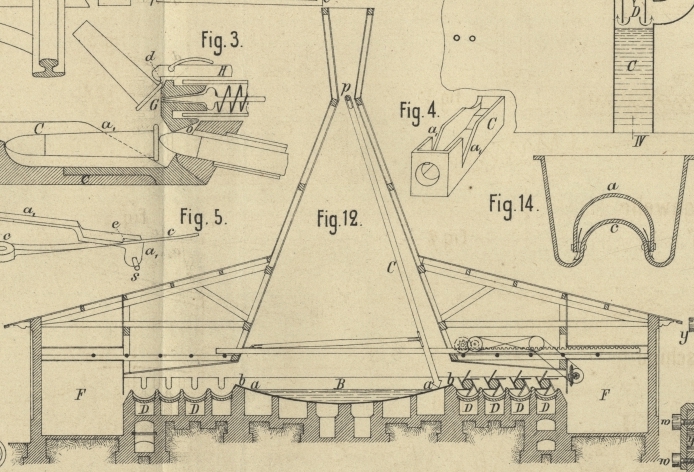 Auskrücken des ausgeschiedenen Salzes geschieht durch ein um den Zapfen p schwingendes Brett, welches das Salz zur ersten