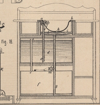 darin befindliche Luft, welche nun auf das unreine Wasser in f und dieses in den Eimer drückt. Dabei füllt sich der Behälter d wieder vollständig mit reinem Wasser und der Apparat