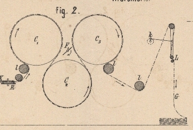Maschine, dort zweimal hin und her über die Walzen L