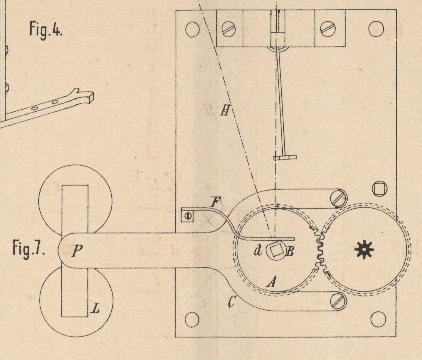 letzteren jedoch theil hat. Für gewöhnlich nimmt die Scheibe D das Zeigerrad A durch Reibung mit, indem