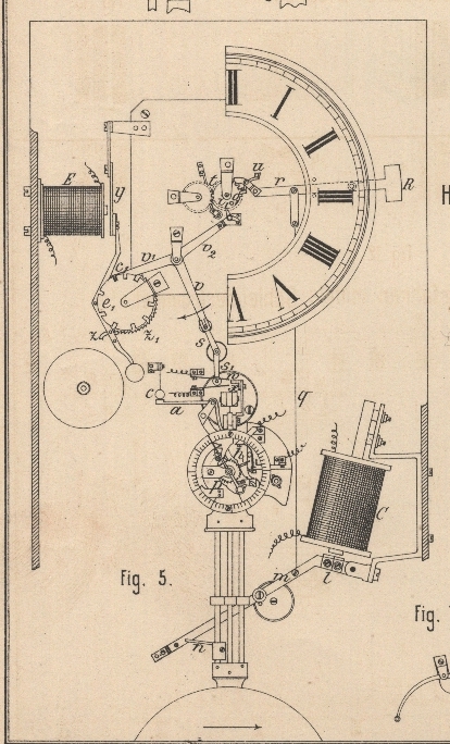 der mit demselben mittels Schnur q verbundene Hebel r – entsprechend der Wirkung des Gewichtes R – mit seiner Sperrklinke aus dem Minutensperrrade t ausgelöst worden; sobald aber der Anker des