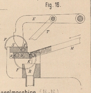 links verschoben, so daſs der Nagel aus dessen Höhlung K herausgleitet und in den Zuführungstrichter R fällt, von wo er direkt unter den Hammer gelangt. Hierauf bewegt sich