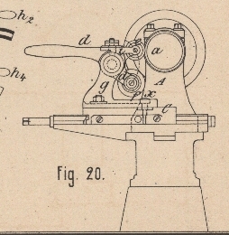 Mit diesem Hebel ist horizontal drehbar ein zweiter Hebel i verbunden, so daſs eine Art Zange entsteht. Ein zwischen dem Zangenmaule