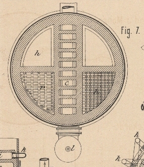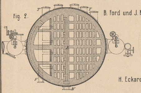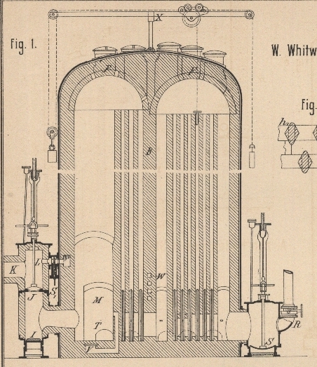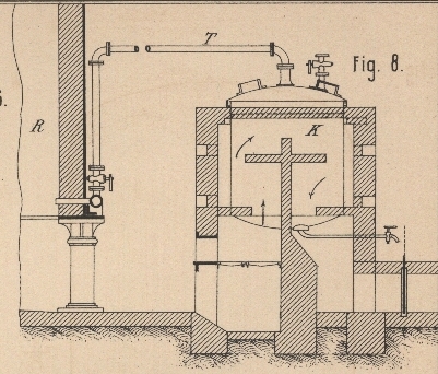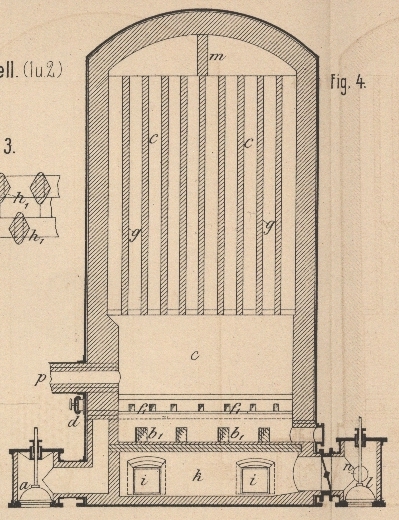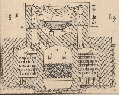 Ueber Neuerungen im Eisenhüttenwesen. (Patentklasse 18. Fortsetzung des Berichtes Bd. 249 S. 440.) Mit Abbildungen im Texte und auf Tafel 26. Ueber Neuerungen im Eisenhüttenwesen. Wie groſse Vortheile hoch erhitzter Wind für den Hochofenbetrieb hat, haben neuerdings Versuche von W. Hawdon in Middlesborough bewiesen. Nach dem von ihm vor dem Iron and Steel Institute gehaltenen Vortrage (vgl. Engineering, 1883 Bd. 35 S. 455) stieg durch die Erhöhung der Windtemperatur von 532° (eiserne Winderhitzer) auf 768° (Cowper'sche Apparate) die Production eines Hochofens wöchentlich um 14,7 Proc., während der Verbrauch an Kokes um 6,4 Proc. sank. Textabbildung Bd. 251, S. 352 Für seine steinernen Apparate verwendet Cowper neuerdings Füllsteine von dem beistehend skizzirten Querschnitte (vgl. Engineering, 1883 Bd. 36 S. 161 und 254). Wie hieraus hervorgeht, läſst sich das Profil dieser Füllung in verschiedener Weise in handliche, bequem in guten Verband zu bringende Stücke zerlegen. Die einzelnen Steine können in den Drainröhrenpressen ähnlichen Maschinen hergestellt werden. (Vgl. Steffen 1883 248 * 500.) Der in den Fig. 1 und 2 Taf. 26 dargestellte Winderhitzungsapparat von Will. Whitwell in Stockton-on-Tees (* D. R. P. Nr. 24439 vom 29. December 1882) hat gegen frühere Ausführungen (vgl. 1882 245 * 161) insofern eine Abänderung erfahren, als er durch die Scheidewand B in zwei Abtheilungen getheilt ist, deren jede mit einem Gewölbe abgeschlossen ist, welches sich einerseits auf die Mittelwand, andererseits auf die Auſsenwand stützt; jedes Gewölbe überdeckt auf diese Weise einen Kanal, der als Brennkammer für die Heizgase dient, und eine Anzahl Kanäle, welche zur Wärmeabgabe dienen, wenn der Apparat durch brennendes Gas erhitzt worden ist. Auch ist der obere Abschluſs des Apparates in der Weise gegen früher geändert, als über diesen beiden erwähnten Gewölben sich bis zur parabolisch geformten Kuppel aus Metall erstreckendes Mauerwerk angebracht ist, welches Wärmeverlust verhindern soll. Der aus der Metallkuppel, dem Mauerwerke und den Gewölben bestehende Abschluſs ist in geeigneter Weise durchbrochen und sind diese Durchbrechungen durch Blöcke F geschlossen, so daſs durch Wegnahme der letzteren die Einführung von Reinigungsgeräthen erfolgen kann. Der Betrieb des Apparates geht folgendermaſsen vor sich: Ist das Ventil I an der einen Seite des Ofens für den Eintritt der Heizgase geöffnet, so ist auf der entgegengesetzten Seite auch das Ventil R zum Abzüge der Verbrennungsproducte geöffnet; gleichzeitig sind die Ventile J und S geschlossen. Ist S für den Eintritt frischen Windes und J für den Auslaſs des erhitzten Windes geöffnet, so sind I und R geschlossen. Der abziehende heiſse Wind gelangt durch J in den Kanal K, welcher bei Anwendung mehrerer Apparate in den allen Apparaten gemeinschaftlichen Heiſswindkanal mündet. Es ist also über dem Ventile J stets heiſser Wind vorhanden, von dem eine geringe Menge durch Kanal L und Schieber S1 in die Verbrennungskammer M eingelassen wird, um die Verbrennung der Gase beim Erhitzen des Ofens zu unterstützen. T bezeichnet Reinigungsthüren im Untertheile des Ofens, während V von auſsen kommende Luftkanäle sind und die Luftlöcher W die Verbrennung in der Verbrennungskammer und beim Uebertritte der Gase in die zweite Ofenabtheilung unterstützen sollen. Der Drehkrahn X mit Laufkatze dient zum Anhängen des Werkzeuges zur Reinigung der Kanäle. Dasselbe hängt am Ende einer Kette, welche über eine am Wagen und eine am äuſsersten Ende des wagrechten Balkens befestigte Rolle geht und mit ihrem Ende an diesem Balken befestigt ist; in der gebildeten Schleife hängt ein Gewicht. Eine zweite Kette ist am Wagen befestigt und hängt über eine am anderen Ende des Balkens befestigte Rolle, mittels Gewichtes beschwert. Durch diese sich ausgleichenden Gewichte wird die Stellung des Wagens über den Reinigungslöchern gesichert. Bei dem Winderhitzungsapparate von B. Ford und J. Moncur in London (* D. R. P. Nr. 24134 vom 3. Februar 1883) tritt das Gas, mit welchem der Apparat geheizt wird, durch das Ventil a (Fig. 4 bis 7 Taf. 26) in die horizontalen Züge b, von denen verschiedene Oeffnungen b1 nach dem unteren Theile der Verbrennungskammer c gehen. Durch ein Ventil d wird Luft in die horizontalen Züge f eingelassen, welche nach der Verbrennungskammer c dicht über den Gaskanälen b1 ausmündende Oeffnungen f1 besitzen. Der obere Theil der Verbrennungskammer c ist mit Quermauern g versehen. Der eigentliche Regenerator h, welcher durch die Verbrennungskammer c und die Wand m in 4 Abtheilungen geschieden ist, besteht aus parallelen Wänden, die durch Spreizen h1 (Fig. 3) von dreieckigem oder rautenförmigem Querschnitte gegen einander abgesteift sind und durch Träger r unterstützt werden. Innere Ventile i, welche von auſsen leicht bewegt werden können, öffnen sich nach dem centralen Kanale k, welcher durch das Ventil l mit einem Schornsteine in Verbindung steht. Der kalte Wind wird durch ein Ventil n eingelassen, während der erhitzte Wind den Apparat durch Rohr p verläſst. Um den Apparat zu heizen, wird Gas durch das Ventil a in die Züge b gelassen; dieses tritt durch die Oeffnungen b1 in die Verbrennungskammer c. Luft tritt gleichzeitig durch d in die Kanäle f und f1 zu dem Gase, um sich mit demselben zu vermischen. Dieses Gemisch vertheilt sich in der Verbrennungskammer c, in welcher es verbrennt. Das Innere der Kammer c und die Querwände g werden dadurch stark erhitzt und die erhitzten Verbrennungsproducte fallen durch den Regenerator h nieder, dessen parallele Wände und Spreizen h1 eine groſse Oberfläche darbieten, durch welche der gröſste Theil der Wärme absorbirt wird. Hierauf streichen die Verbrennungsproducte durch die Ventile i in den Kanal k und durch das Ventil l in den Schornstein. Um die Temperatur des Windes gleichmäſsig zu erhöhen, nachdem der Apparat in der eben beschriebenen Weise