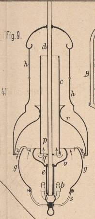 l gegen den Sammelraum h abgedeckt. Das zuströmende Gas wird im Rohre k sowie im Inneren der Lampe im Kegel h und