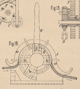 Die in dem Gehäuse A drehbar gelagerte Scheibe B ist mit Taschen oder Vertiefungen h versehen, in welche eine Speiche H eingesteckt wird, um mittels derselben die Scheibe