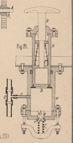 öffnet, wenn die Bufferfeder f in der Hülse H gänzlich zusammengepreſst ist. Das Röhrchen o stellt die Verbindung zwischen dem