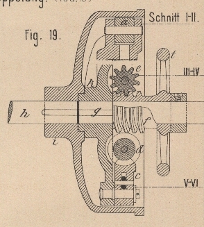 e eingreifenden und mittels des Handrades t bethätigten Schraube ohne Ende f. i ist der auf dem einen Wellenende h festgekeilte Bremsring, k eine auf dem anderen Wellenende g