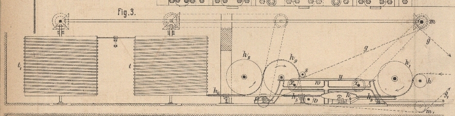 Ablegevorrichtung trennen sich beide Bänder g, g1 von einander, indem das obere Band g über die Walze s nach