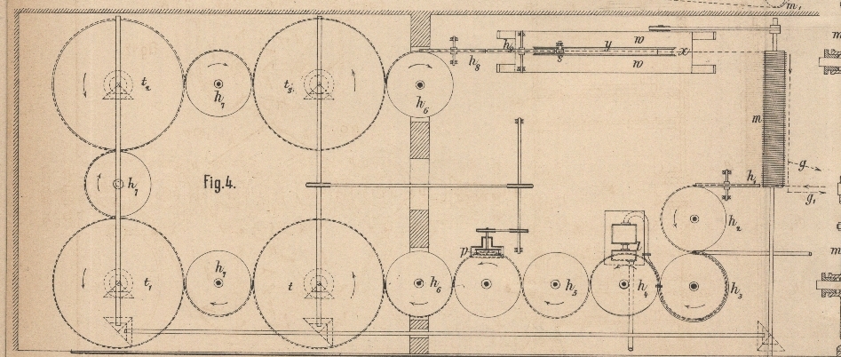 Räumlichkeiten getrennten Trockenraum über die Scheibe h6 auf die Trockencylinder t bis t1. Diese bestehen aus einem Blechmantel, über