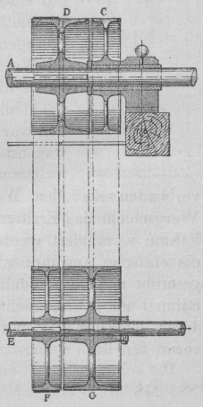 treibenden Welle A eine breite Scheibe D festgekeilt, welcher auf der getriebenen die Fest-