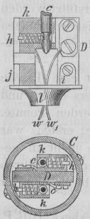 Innenseite der senkrechten cylindrischen Oeffnung in dem Metallstücke k hervorzutreten und den Stift c nach dem Eindringen desselben fest zu halten. Zum Schütze der