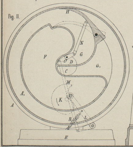 Klappe H verbunden ist. Die Curvenscheibe K dreht sich in der eingezeichneten Pfeilrichtung,