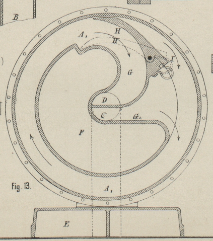 I niederdrückt und damit den Druckkanal G öffnet. Das mit der Trommel A kreisende Wasser wird in Folge dessen und durch die eigenthümliche Form