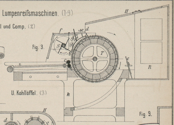 umführenden und untertauchenden Flügelwelle der gebräuchlichen Lumpenwaschmaschine eine Reiſstrommel an, welche gegen eine feste, mit Zähnen besetzte Schiene