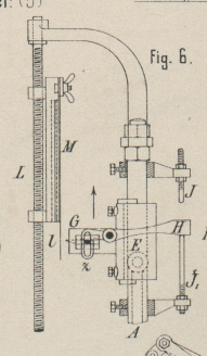 des Trägers E schlägt das eine Ende des Hebels H gegen zwei an den Führungssäulen A stellbare Stifte J und