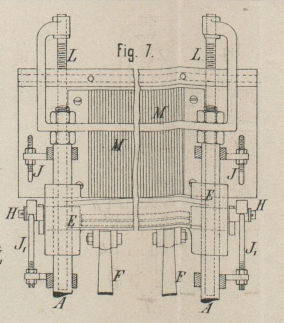 angegeben. An Stelle der Reiſstrommel tritt hier eine guſseiserne Trommel T, auf welcher schraubengangförmig Messingplatten mit