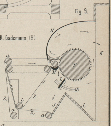 Nr. 30880 vom 7. September 1884) ein zweites Zuführtuch Z1 angeordnet, welches die ausgeworfenen ungerissenen Theile beständig zur