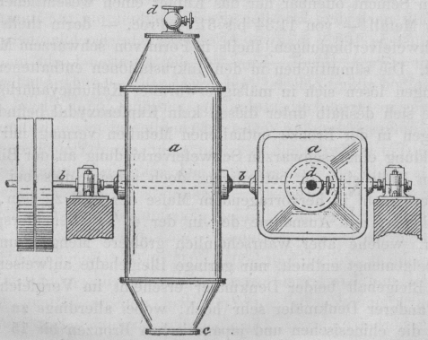 Entleerungshähnen d versehenen Mischgefäſse a auf einer Achse b