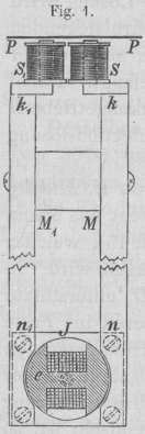 an den Stabenden k und k1 angesetzten Kerne der Spulen S und S1 ausgeübt wird, – wie bei dem nach Münch's Patent hergestellten Rufapparate – durch das
