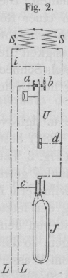 U hinzugefügt, welche für gewöhnlich, wie in Fig. 2, die Inductionsspule J zwischen c und d über a kurz schlieſst, während der