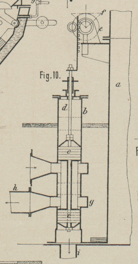 das Rohr h von oben in den Treibcylinder a und drückt dessen Kolben nach abwärts. Soll umgesteuert werden, so wird der Steuerkolben c in die punktirte Lage gebracht, in Folge dessen das