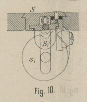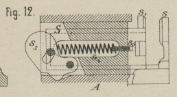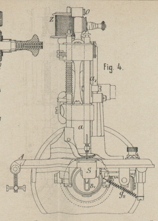 ist. Das andere Ende der Feder s4 drückt gegen einen im unteren Schieber S1 eingeschraubten Stift und dieser legt sich gegen die