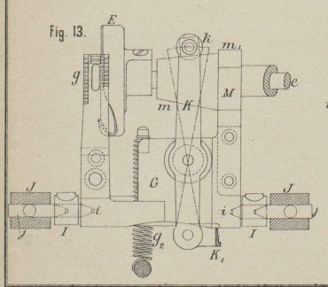 mit ihrer flachen Seite anliegt. Dieselbe sitzt an dem Hebel K, welcher um einen Bolzen auf dem Theile G